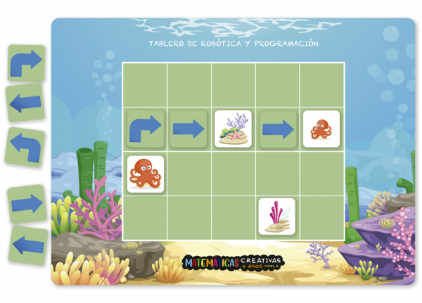 Atractivo tablero con piezas troqueladas para desarrollar la direccionalidad y el pensamiento lógico y computacional de forma sencilla y divertida.